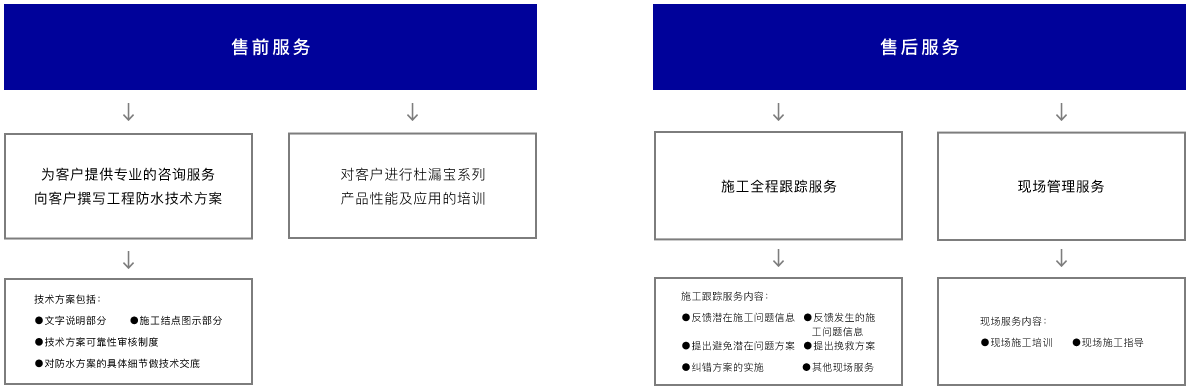 公司拥有经验丰富的技术服务团队,专业化、系统化量身定制为轨道交通、综合管廊、海绵城市、民用建筑、家装工程、海外工程等领域的重大项目提供防水解决全方位的服务,并承诺在规定的防水工程质量保证期内免费维修。