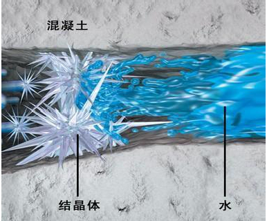随着时间的发展,结晶体在结构孔隙中不断沉淀,不断增多,由疏至密,逐渐填塞结构孔隙,从而使混凝土变得致密,起到防水抗渗的效果。